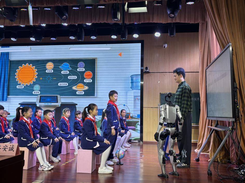 △长沙市实验小学科技节开幕式现场,学生表演AI 机器人情景剧《你好,小实同学》。