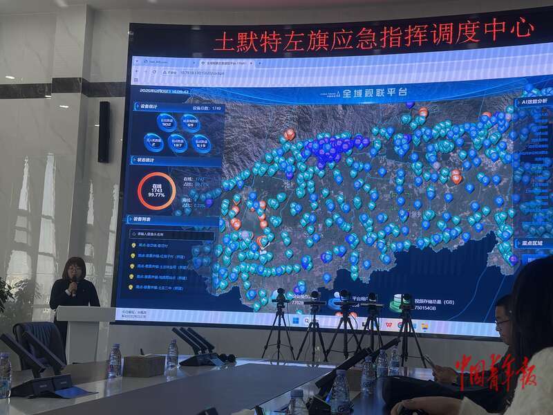 如果说幸福院是温暖的“港湾”,那么土默特左旗应急指挥调度中心,则是守护全旗安全的“智慧大脑”。在应急指挥中心巨大的电子屏上,全旗河流水位、地质灾害隐患等信息一目了然。土默特左旗气象台台长刘敏向记者演示了智慧应急平台如何运作。